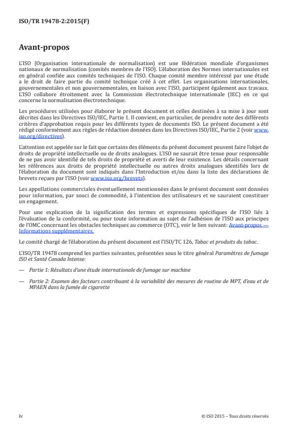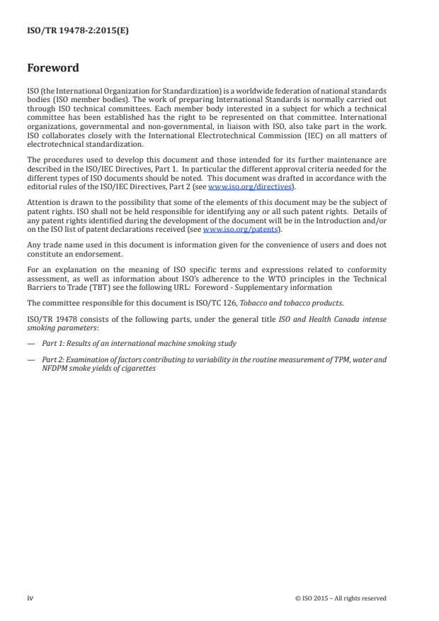 ISO/TR 19478-2:2015 is a technical report published by the International Organization for Standardization (ISO). Its full title is "ISO and Health Canada intense smoking parameters - Part 2: Examination of factors contributing to variability in the routine measurement of TPM, water and NFDPM smoke yields of cigarettes". This standard covers: ISO/TR 19478-2:2015 extends the analysis reported in ISO/TR 19478‑1:2014 and reports additional studies focused on the conclusions i) and j) from that Technical Report. It identifies and assesses factors impacting on the measurement of smoke TPM, NFDPM, nicotine, water, and carbon monoxide yields when increasing the intensity of the puffing regime from that specified in ISO 3308:2000 to the regime specified in Health Canada Method T-115.