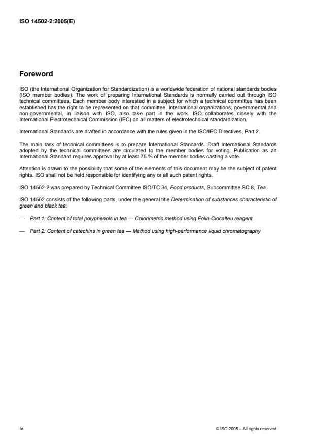 ISO 14502-2:2005 specifies a validated high-performance liquid chromatography (HPLC) method for determining the total catechin content in tea by summing individual catechins. The method is designed primarily for green tea (leaf and instant) and - with stated precision limitations - can be applied to black tea. The standard also allows determination of gallic acid, caffeine, theogallin and theaflavins using the same HPLC procedure.