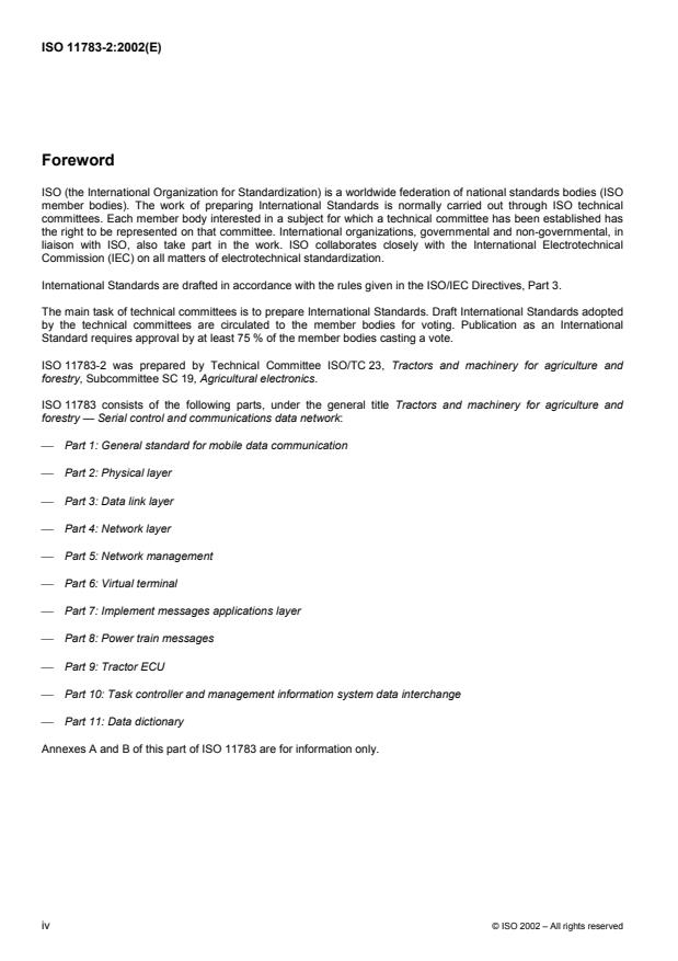 ISO 11783-2:2002 is a standard published by the International Organization for Standardization (ISO). Its full title is "Tractors and machinery for agriculture and forestry - Serial control and communications data network - Part 2: Physical layer". This standard covers: Tractors and machinery for agriculture and forestry - Serial control and communications data network - Part 2: Physical layer