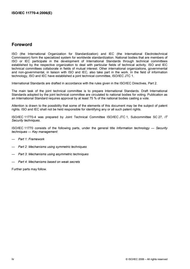 ISO/IEC 11770-4:2006 is a standard published by the International Organization for Standardization (ISO). Its full title is "Information technology — Security techniques — Key management — Part 4: Mechanisms based on weak secrets". This standard covers: ISO/IEC 11770-4:2006 defines key establishment mechanisms based on weak secrets, i.e., secrets that can be readily memorized by a human, and hence secrets that will be chosen from a relatively small set of possibilities. It specifies cryptographic techniques specifically designed to establish one or more secret keys based on a weak secret derived from a memorized password, while preventing off-line brute-force attacks associated with the weak secret. More specifically, these mechanisms are designed to achieve one of the following three goals. Balanced password-authenticated key agreement: Establish one or more shared secret keys between two entities that share a common weak secret. In a balanced password-authenticated key agreement mechanism, the shared secret keys are the result of a data exchange between the two entities, the shared secret keys are established if and only if the two entities have used the same weak secret, and neither of the two entities can predetermine the values of the shared secret keys. Augmented password-authenticated key agreement: Establish one or more shared secret keys between two entities A and B, where A has a weak secret and B has verification data derived from a one-way function of A's weak secret. In an augmented password-authenticated key agreement mechanism, the shared secret keys are the result of a data exchange between the two entities, the shared secret keys are established if and only if the two entities have used the weak secret and the corresponding verification data, and neither of the two entities can predetermine the values of the shared secret keys. Password-authenticated key retrieval: Establish one or more secret keys for an entity, A, associated with another entity, B, where A has a weak secret and B has a strong secret associated with A's weak secret. In an authenticated key retrieval mechanism, the secret keys, retrievable by A (not necessarily derivable by B), are the result of a data exchange between the two entities, and the secret keys are established if and only if the two entities have used the weak secret and the associated strong secret. However, although B's strong secret is associated with A's weak secret, the strong secret does not (in itself) contain sufficient information to permit either the weak secret or the secret keys established in the mechanism to be determined.