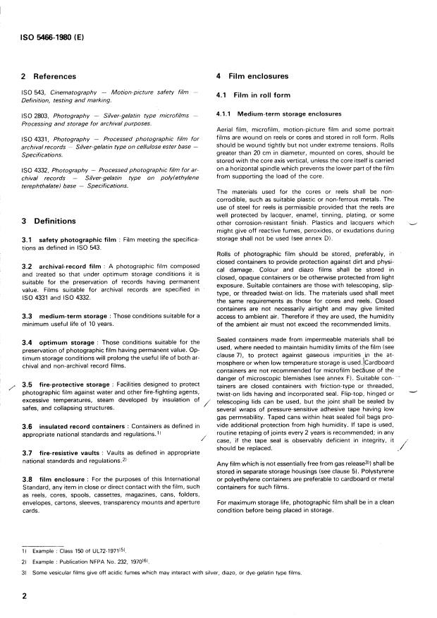 ISO 5466:1980 is a standard published by the International Organization for Standardization (ISO). Its full title is "Photography — Practice for the storage of processed safety photographic film". This standard covers: Photography — Practice for the storage of processed safety photographic film
