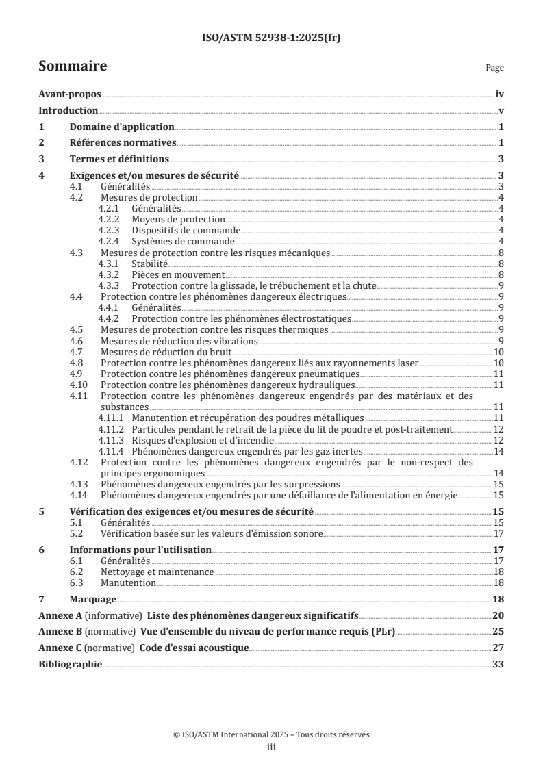 Le présent document traite des exigences techniques et des moyens permettant leur vérification pour les machines de fabrication additive (FA) utilisant un lit de poudre métallique, hors matières premières pyrophoriques, et un laser ci-après désigné par le terme «machine». Le présent document traite de tous les phénomènes dangereux, situations dangereuses ou événements dangereux significatifs susceptibles de survenir au cours de toutes les phases du cycle de vie de la machine (ISO 12100:2010, 5.4), énumérés à l'Annexe A, causés par des machines de FA utilisant un lit de poudre métallique et un laser en utilisation normale et quand elles font l'objet d'un mauvais usage raisonnablement prévisible par le fabricant. Le présent document ne traite pas des phénomènes dangereux pouvant se produire: — pendant les phases de conception et de construction de la machine de fusion sur lit de poudre à faisceau laser (PBF-LB) elle-même; — lors de l'exploitation en atmosphères potentiellement explosibles. Le présent document ne s'applique pas aux technologies autres que celles de FA de métaux PBF-LB. Le présent document n'est pas applicable aux machines fabriquées avant la date de sa publication.