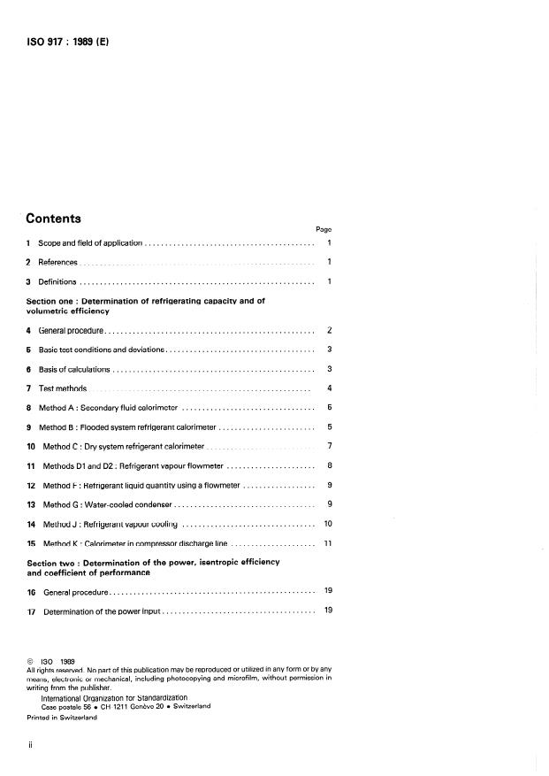 ISO 917:1989 is a standard published by the International Organization for Standardization (ISO). Its full title is "Testing of refrigerant compressors". This standard covers: The provisions are applicable to single-stage refrigerant compressors of the positive-displacement type only. Selected test methods are described for the determination of the refrigerating capacity, power, isentropric efficiency, and the coefficient of performance. The test methods described may also be used as a guide for testing other types of refrigerant compressors. - Replaces the first edition (ISO 917:1974) and constitutes its technical revision.