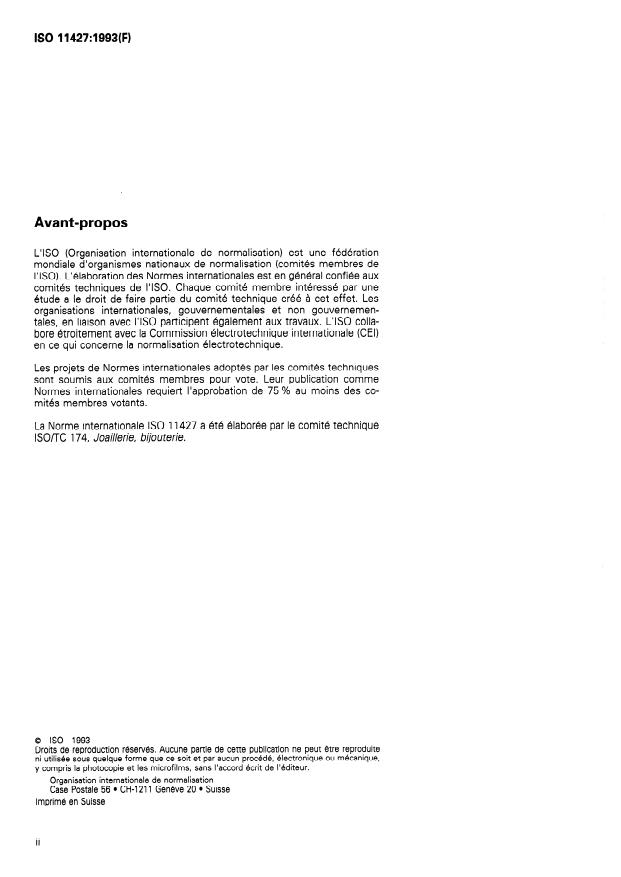 ISO 11427:1993 is classified under the following ICS (International Classification for Standards) categories: 39.060 - Jewellery. The ICS classification helps identify the subject area and facilitates finding related standards.