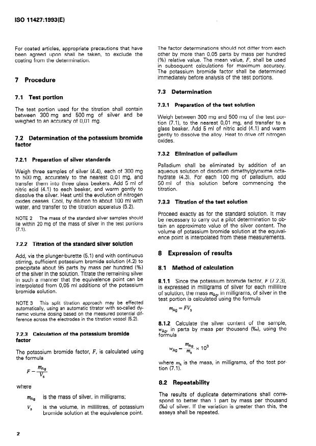 ISO 11427:1993 is a standard published by the International Organization for Standardization (ISO). Its full title is "Determination of silver in silver jewellery alloys — Volumetric (potentiometric) method using potassium bromide". This standard covers: The principle of the method specified is dissolving the sample in dilute nitric acid and determining the silver content of the resulting solution by titration with standard potassium bromide solution, using a potentiometric indication of the equivalence point. The alloys, preferably within the range of fineness stated in ISO 9202, may contain copper, zinc, cadmium and palladium. Apart from palladium, which must be precipitated before commencing titration, these elements do not interfere with this method of determination.