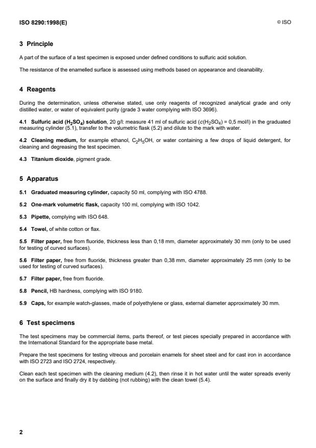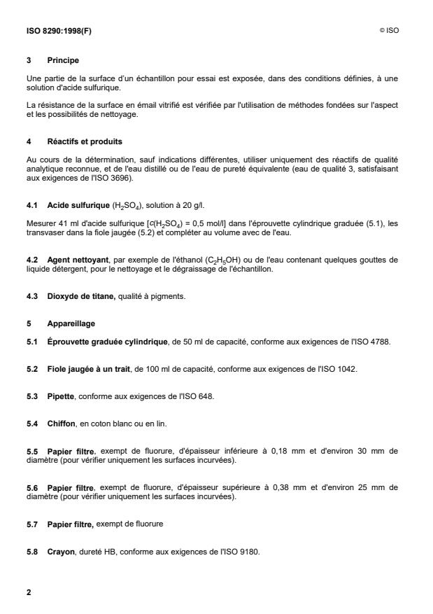 ISO 8290:1998 is a standard published by the International Organization for Standardization (ISO). Its full title is "Vitreous and porcelain enamels — Determination of resistance to sulfuric acid at room temperature". This standard covers: Vitreous and porcelain enamels — Determination of resistance to sulfuric acid at room temperature