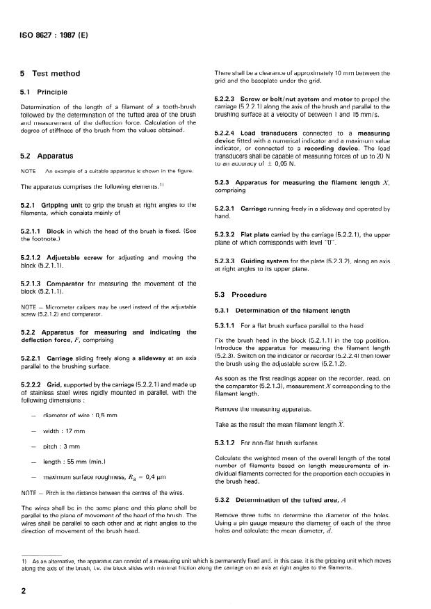 ISO 8627:1987 is a standard published by the International Organization for Standardization (ISO). Its full title is "Dentistry — Stiffness of the tufted area of tooth-brushes". This standard covers: Specification of a test method and grading scheme for the stiffness of the tufted area of conventional manual tooth-brushes, together with the relevant information concerning definitions and those concerning testing machines. The original number of classifications of five categories has been reduced to three ones, i.e. soft, medium and hard. Eight definitions of important terms are given.