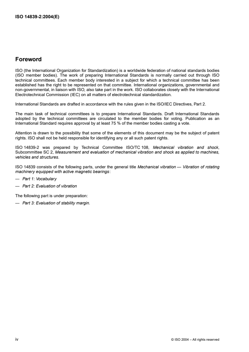 ISO 14839-2:2004 is a standard published by the International Organization for Standardization (ISO). Its full title is "Mechanical vibration - Vibration of rotating machinery equipped with active magnetic bearings - Part 2: Evaluation of vibration". This standard covers: ISO 14839-2:2004 sets out general guidelines for measuring and evaluating rotating machinery equipped with active magnetic bearings (AMBs) with respect to the following two indices: shaft vibratory displacement measured at or close to the AMBs; and working current and voltage measured in magnetic coils or power supply amplifiers. Both indices are measured under nominal operating conditions in house and/or on site. These guidelines are presented in terms of both steady-state running values of these indices and any magnitude changes which may occur in these steady-state operations. ISO 14839-2:2004 is applicable to industrial rotating machines generating or consuming nominal power greater than 15 kW, and is not limited by size or operational rated speed (i.e. comprising turbo-compressors, turbo-pumps, steam turbines, turbo-generators, turbo-fans, electric drives and other rotors supported by AMBs). It establishes the vibration, current and voltage evaluation of the rotating machinery equipped with AMBs, specified by a comparatively large power capacity as described above, excluding small-scale rotors such as turbo-molecular pumps, spindles and flywheels. ISO 14839-2:2004 covers both AMB-equipped rigid rotors and AMB-equipped flexible rotors.
