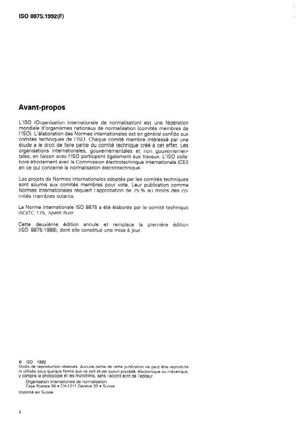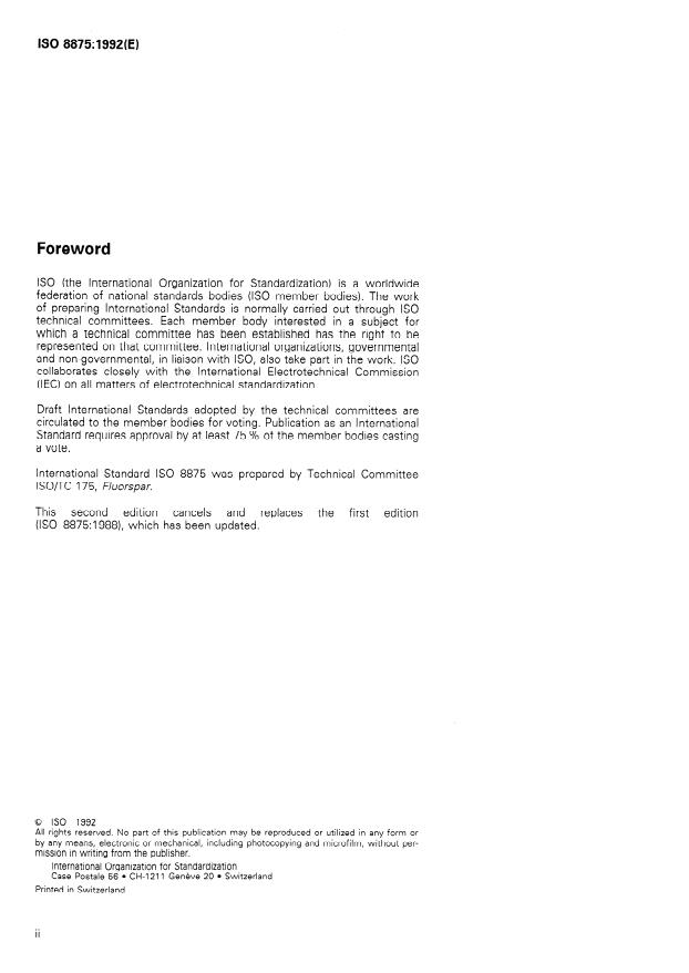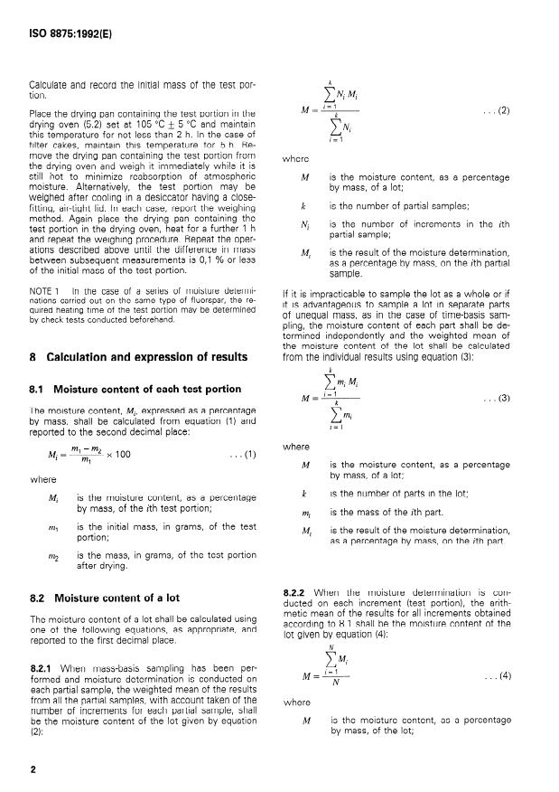 ISO 8875:1992 is a standard published by the International Organization for Standardization (ISO). Its full title is "All grades of fluorspar — Determination of moisture content of a lot". This standard covers: The principle of the method is drying of a test portion in air at 105 °C to constant mass. Determines the mean value of the moisture content.