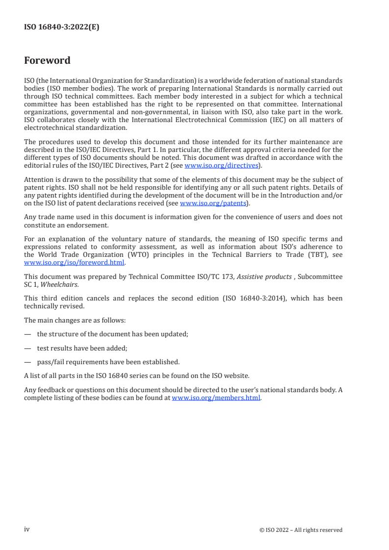ISO 16840-3:2022 is a standard published by the International Organization for Standardization (ISO). Its full title is "Wheelchair seating - Part 3: Determination of static, impact, and repetitive load strengths for postural support devices". This standard covers: This document specifies requirements for static, impact, and repetitive load strengths for postural support devices (PSDs) with associated attachment hardware intended for use with an undefined wheelchair seating system. It specifies the test methods for determining whether the minimum performance requirements have been met to release a product into use. It also specifies requirements for disclosure of the test results. Not all tests apply to all PSDs. This document is also applicable to other seating systems. The test methods can be used to verify the manufacturer’s claims that a product meets the requirements of this document. This document does not apply to PSDs that are designed to fail under certain static, dynamic, or repetitive loads. This document does not apply to the strength of PSDs under crash conditions in a motor vehicle. This document does not evaluate long-term useful life. NOTE 1 ISO 16840‑4 provides crash test methods and requirements for wheelchair seating systems when used as part of a wheelchair seat in a motor vehicle. NOTE 2 For user masses greater or less than those specified in this document, appropriate extrapolation of test apparatus dimensions, mounting point separation, forces, etc. can be carried out, and the test parameters noted in the test report. NOTE 3 Rigid surrogate test fixtures are utilized to provide a standardized test method, and consequently this document does not involve a test of a PSD on a particular wheelchair.