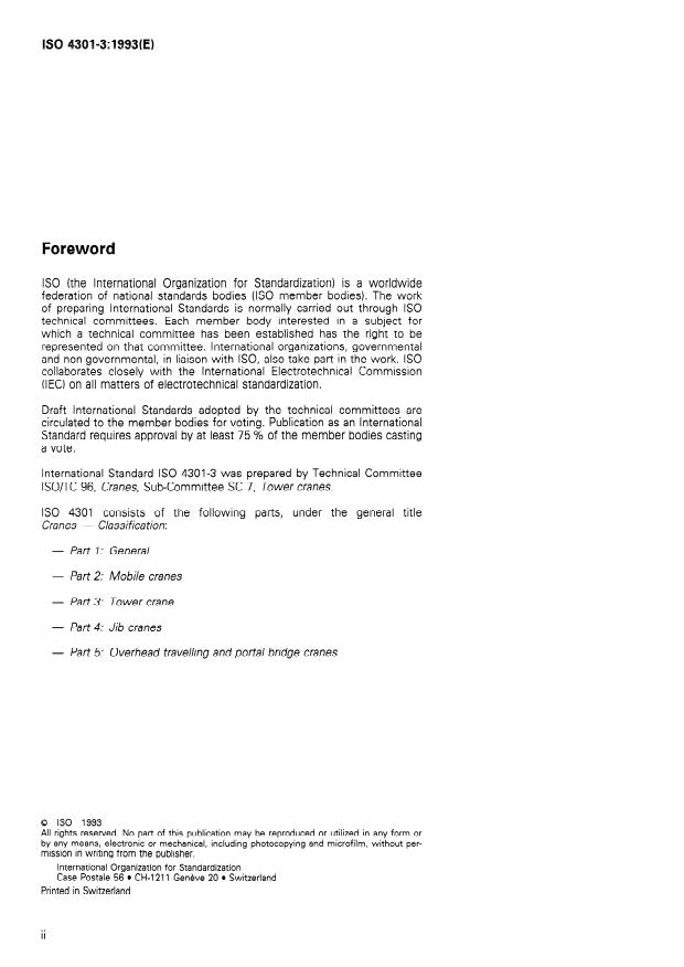 ISO 4301-3:1993 is a standard published by the International Organization for Standardization (ISO). Its full title is "Cranes — Classification — Part 3: Tower cranes". This standard covers: Establishes a classification of tower cranes as defined in ISO 4306-3, according to their category (1: in irregular use or having a light state of loading, 2: for building, 3: in regular use or having a heavy state of loading). Applies to the classification of tower cranes for building and general construction work that can be dismantled, permanently erected tower cranes, hammerhead cranes, dockside and shipbuilders' tower cranes. Does not apply to the classification of power-driven mobile jib cranes which may be fitted with a tower attachment and erection masts, with or without jibs.