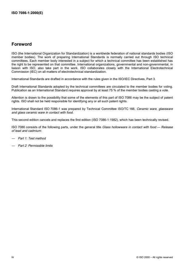 ISO 7086-1:2000 is a standard published by the International Organization for Standardization (ISO). Its full title is "Glass hollowware in contact with food — Release of lead and cadmium — Part 1: Test method". This standard covers: Glass hollowware in contact with food — Release of lead and cadmium — Part 1: Test method