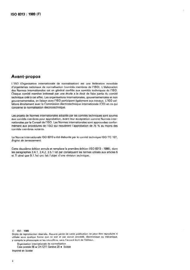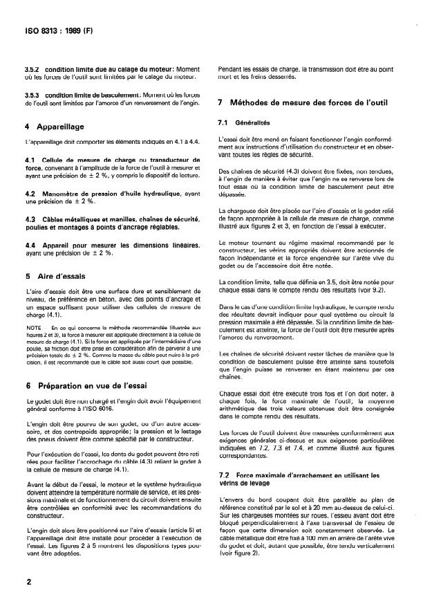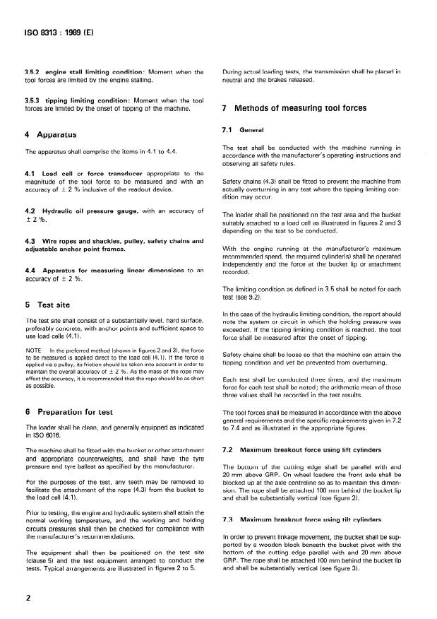 ISO 8313:1989 is a standard published by the International Organization for Standardization (ISO). Its full title is "Earth-moving machinery — Loaders — Methods of measuring tool forces and tipping loads". This standard covers: Applies to crawler and wheeled loaders as defined in ISO 6165. Covers also definitions, apparatus, test site, preparation for test, and test report. Cancels and replaces the first edition (ISO 8313 : 1986), 3.4.1, 3.4.2, 3.5.1 and 9.1.1e) of which it constitutes a technical revision.
