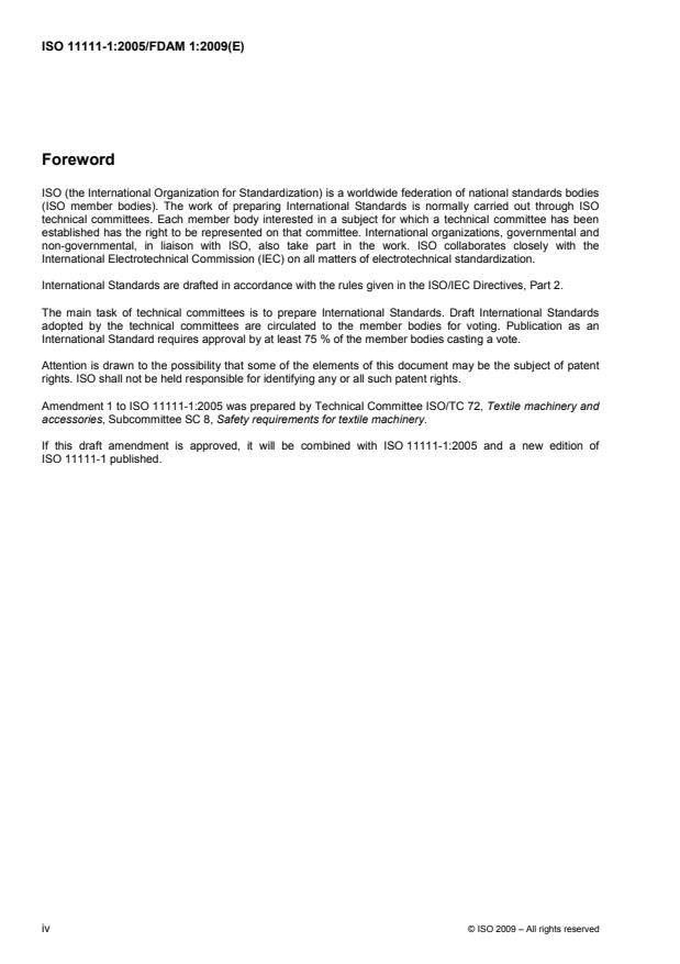 ISO 11111-1:2005/FDAmd 1 is a draft published by the International Organization for Standardization (ISO). Its full title is "Textile machinery — Safety requirements — Part 1: Common requirements — Amendment 1". This standard covers: Textile machinery — Safety requirements — Part 1: Common requirements — Amendment 1