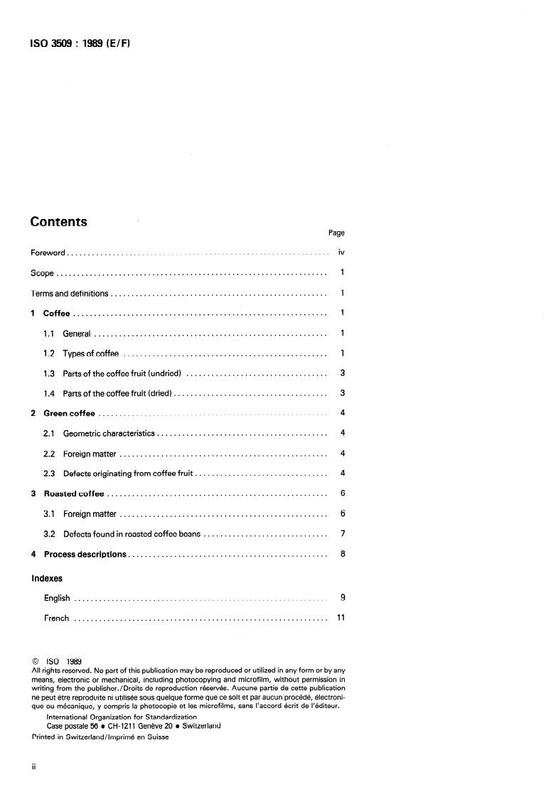 Definitions of the most commonly used terms in English and French. The terms are grouped to the clauses "coffee", " green coffee", "roasted coffee" and "process descriptions". Alphabetical indices in the two languages are added.