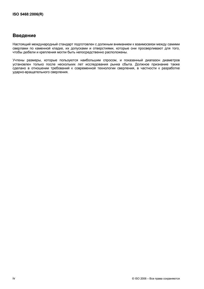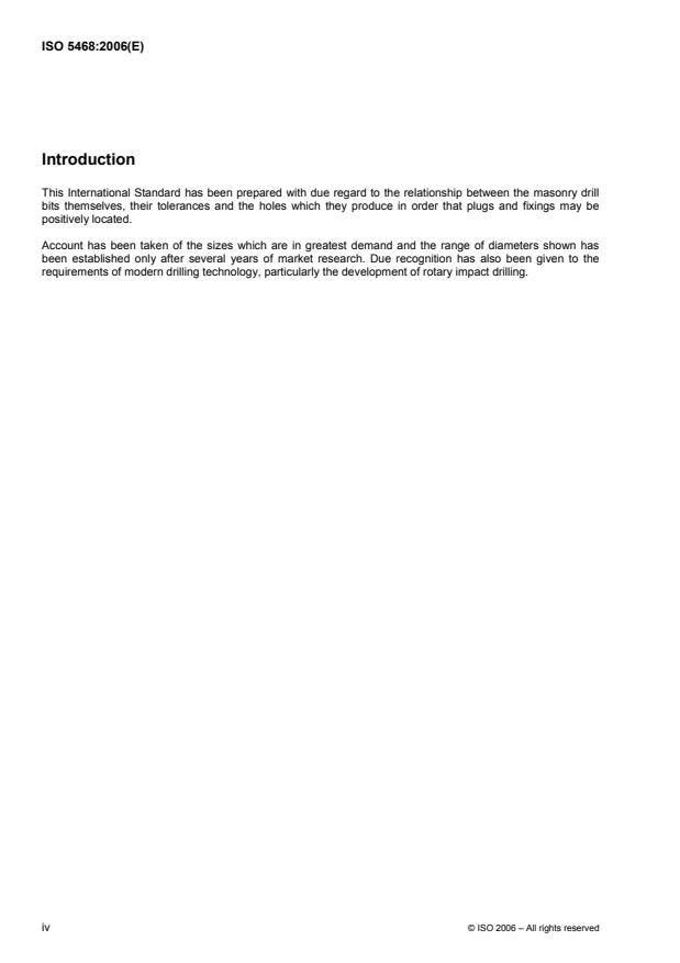 ISO 5468:2006 specifies the dimensions, in millimetres, of rotary and rotary impact masonry drill bits with hardmetal tips, having diameters in the range 4 mm to 25 mm inclusive and overall and working lengths in the series short, long and extra-long. It does not apply to hammer drills.