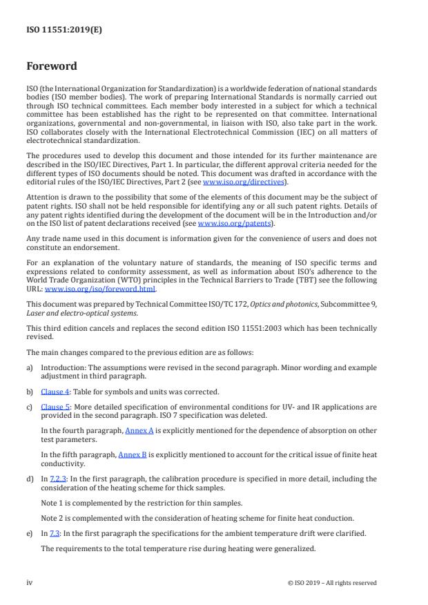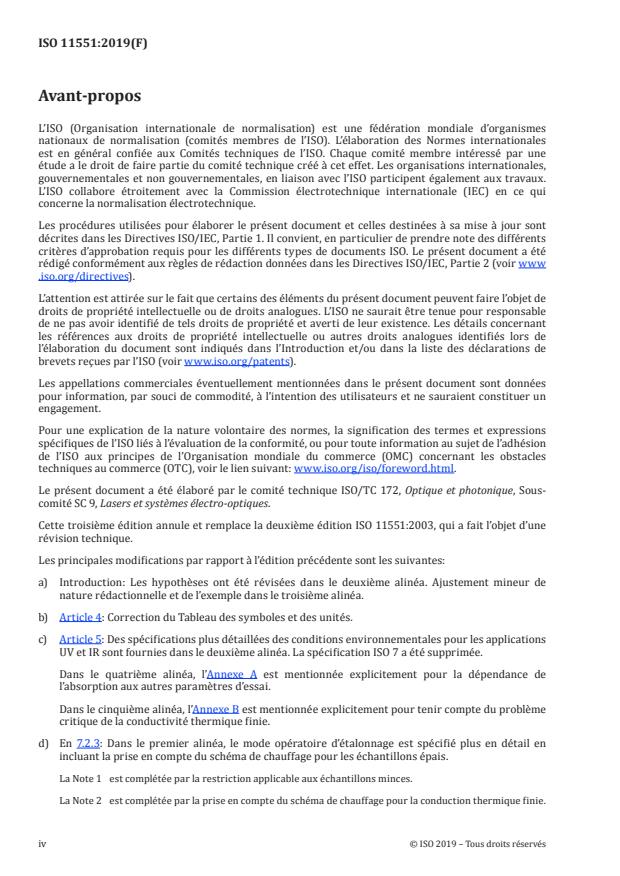 ISO 11551:2019 is a standard published by the International Organization for Standardization (ISO). Its full title is "Optics and photonics — Lasers and laser-related equipment — Test method for absorptance of optical laser components". This standard covers: This document specifies procedures and techniques for obtaining comparable values for the absorptance of optical laser components.