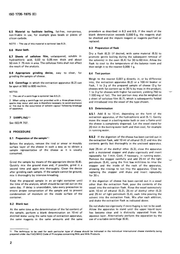 ISO 1735:1975 is a standard published by the International Organization for Standardization (ISO). Its full title is "Cheese and processed cheese products — Determination of fat content (Reference method)". This standard covers: Cheese and processed cheese products — Determination of fat content (Reference method)