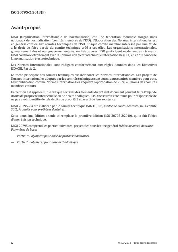 ISO 20795-2:2013 is a standard published by the International Organization for Standardization (ISO). Its full title is "Dentistry - Base polymers - Part 2: Orthodontic base polymers". This standard covers: ISO 20795-2:2013 is applicable to orthodontic base polymers and copolymers used in the construction of both active and passive orthodontic appliances and specifies their requirements. It also specifies test methods to be used in determining compliance with these requirements. It further specifies requirements with respect to packaging and marking the products and to the instructions to be supplied for use of these materials.
