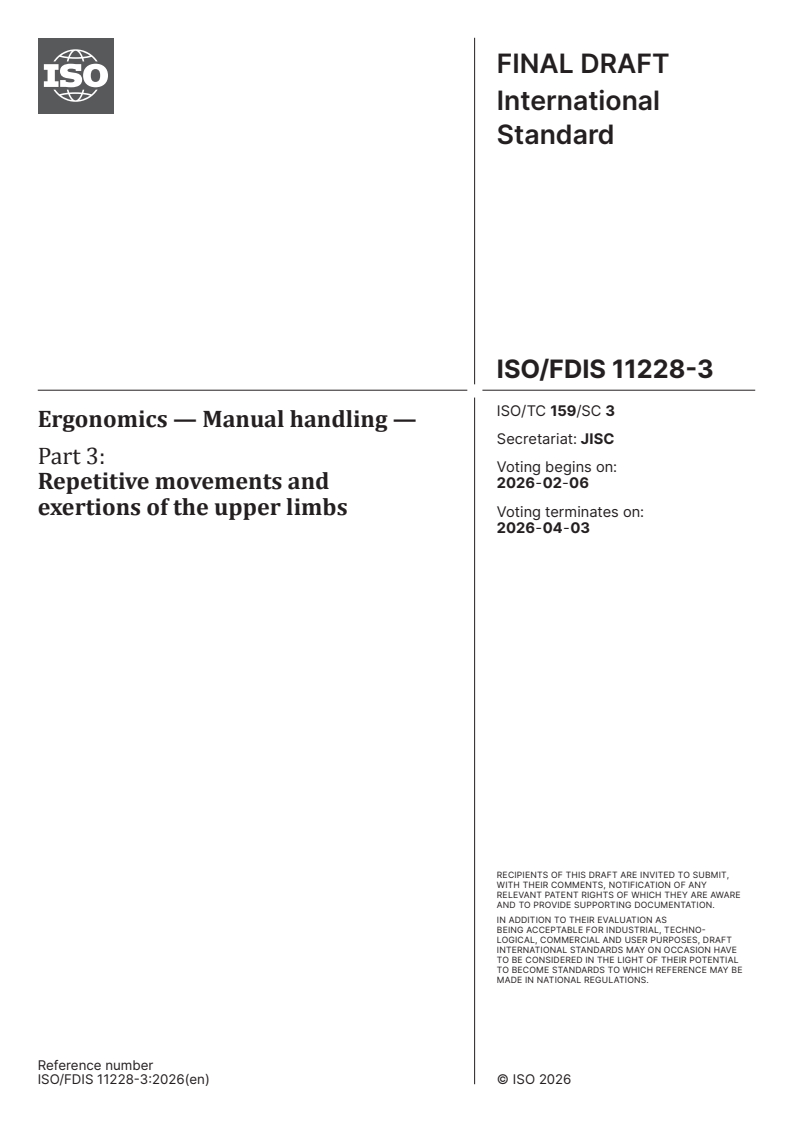 ISO/FDIS 11228-3 - Ergonomics — Manual handling — Part 3: Repetitive movements and exertions of the upper limbs Released:23. 01. 2026