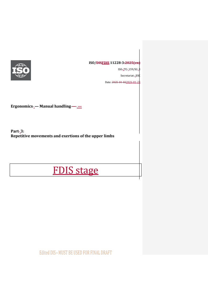 REDLINE ISO/FDIS 11228-3 - Ergonomics — Manual handling — Part 3: Repetitive movements and exertions of the upper limbs Released:23. 01. 2026