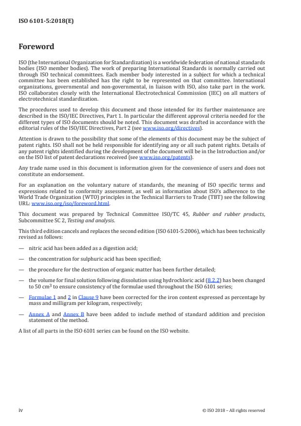 ISO 6101-5:2018 is a standard published by the International Organization for Standardization (ISO). Its full title is "Rubber — Determination of metal content by atomic absorption spectrometry — Part 5: Determination of iron content". This standard covers: This document specifies an atomic absorption spectrometric method for the determination of the iron content of rubbers. The method is applicable to raw rubber, rubber products and latex having iron contents of 5 mg/kg to 1 000 mg/kg. Higher concentrations can be determined, provided that suitable adjustments are made to the mass of the test portion and/or the concentrations of the solution used.