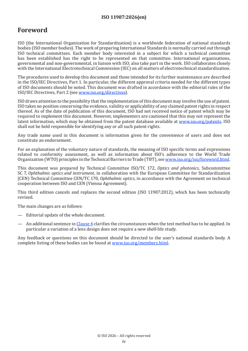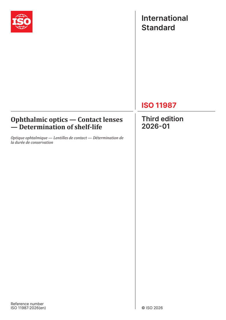 ISO 11987:2026 is a standard published by the International Organization for Standardization (ISO). Its full title is "Ophthalmic optics — Contact lenses — Determination of shelf-life". This standard covers: This document specifies test procedures for determining the stability of contact lenses once they are placed in their final packaging during storage and distribution. NOTE The results obtained can be used for determining the expiry date.