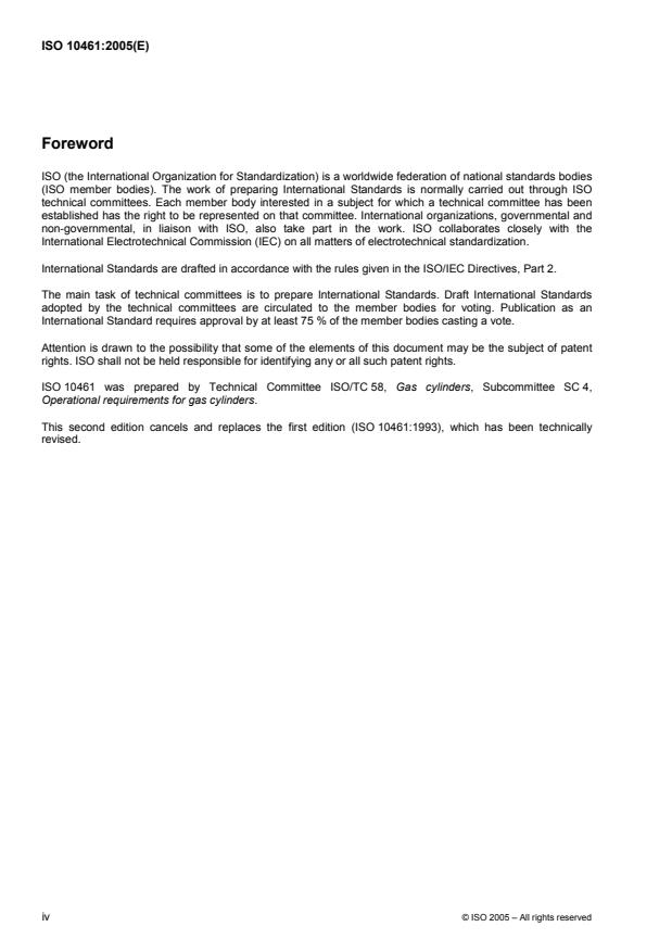 ISO 10461:2005 is a standard published by the International Organization for Standardization (ISO). Its full title is "Gas cylinders — Seamless aluminium-alloy gas cylinders — Periodic inspection and testing". This standard covers: ISO 10461:2005 deals with seamless aluminium-alloy transportable gas cylinders intended for compressed and liquefied gases under pressure, of water capacity from 0,5 l to 150 l; it also applies, as far as practical, to cylinders of less than 0,5 l water capacity. ISO 10461:2005 specifies the requirements for periodic inspection and testing to verify the integrity of such gas cylinders for further service. It does not apply to periodic inspection and testing of acetylene cylinders or composite cylinders with aluminium-alloy liners.