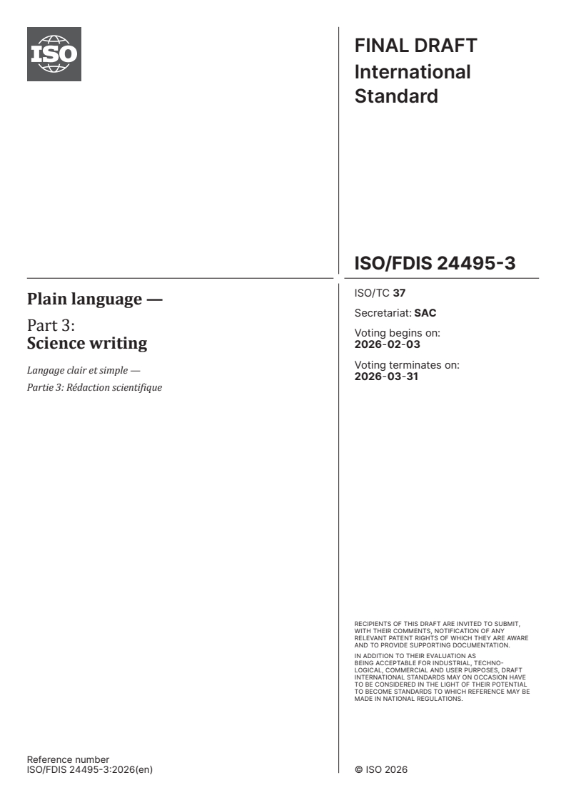 ISO/FDIS 24495-3 - Plain language — Part 3: Science writing Released:20. 01. 2026