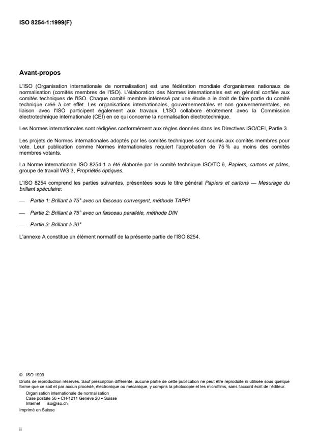 ISO 8254-1:1999 is a standard published by the International Organization for Standardization (ISO). Its full title is "Paper and board — Measurement of specular gloss — Part 1: 75 degree gloss with a converging beam, TAPPI method". This standard covers: Paper and board — Measurement of specular gloss — Part 1: 75 degree gloss with a converging beam, TAPPI method