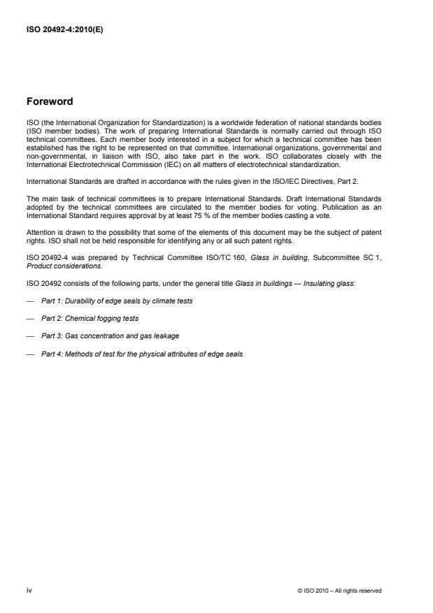 ISO 20492-4:2010 is a standard published by the International Organization for Standardization (ISO). Its full title is "Glass in buildings - Insulating glass - Part 4: Methods of test for the physical attributes of edge seals". This standard covers: ISO 20492-4:2010 specifies methods for testing the edge seal strength, and partially testing the moisture and gas permeation through sealants, of glass insulating units. Other parts of ISO 20492 designate two approaches to the standardization of insulating glass units: approach 1 is intended for use in markets such as North America; and approach 2 is intended for use in markets such as Europe. The methods in ISO 20492-4:2010 are applicable only to approach 2, as defined and used in the other parts of ISO 20492. In cases where there is no protection against direct ultraviolet radiation at the edges, such as structural sealant glazing systems, it is necessary that additional European technical specifications be followed.
