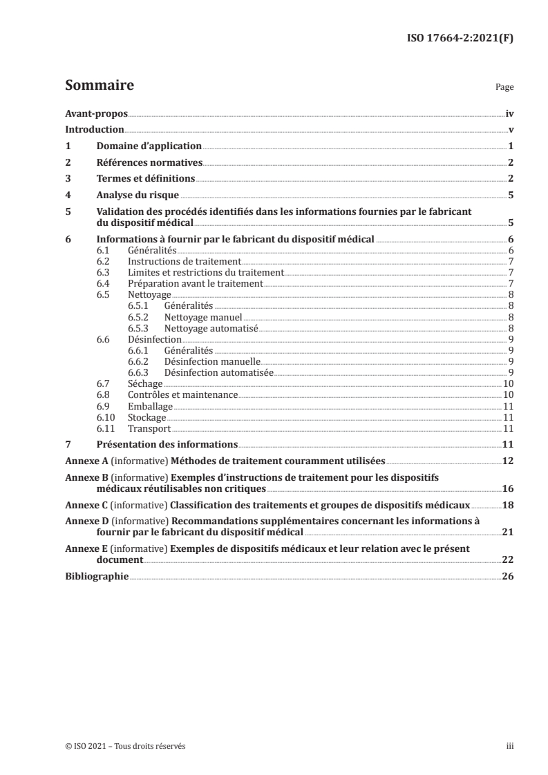 Le présent document spécifie les exigences applicables aux informations relatives au traitement des dispositifs médicaux non critiques et non destinés à être stérilisés, à fournir par le fabricant du dispositif (c'est-à-dire un dispositif médical destiné à entrer en contact avec la peau intacte uniquement ou un dispositif médical qui n'est pas destiné à un contact direct avec le patient). Ces exigences incluent les informations de traitement avant l'utilisation ou la réutilisation du dispositif médical. Les instructions de traitement ne sont pas définies dans le présent document. En revanche, le présent document spécifie des exigences visant à aider les fabricants de dispositifs médicaux à fournir des instructions de traitement détaillées qui comprennent, le cas échéant, les activités suivantes: a) la préparation avant le traitement; b) le nettoyage; c) la désinfection; d) le séchage; e) le contrôle et la maintenance; f) l'emballage; g) le stockage; h) le transport. Le présent document exclut le traitement: 1) des dispositifs médicaux critiques et semi-critiques; 2) des dispositifs médicaux destinés à être stérilisés; 3) des dispositifs médicaux textiles utilisés dans les systèmes de drapage des patients ou les vêtements de chirurgie; 4) des dispositifs médicaux spécifiés par le fabricant comme étant à usage unique et fournis prêts à l'emploi. NOTE Voir l'Annexe E pour obtenir des recommandations supplémentaires concernant l'application de la série de normes ISO 17664 relative aux dispositifs médicaux.