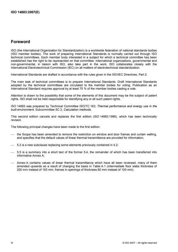 ISO 14683:2007 deals with simplified methods for determining heat flows through linear thermal bridges which occur at junctions of building elements. ISO 14683:2007 specifies requirements relating to thermal bridge catalogues and manual calculation methods. Default values of linear thermal transmittance are given in Annex A for information.