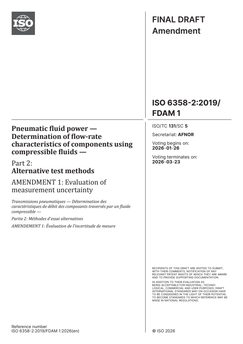 ISO 6358-2:2019/FDAmd 1 - Pneumatic fluid power — Determination of flow-rate characteristics of components using compressible fluids — Part 2: Alternative test methods — Amendment 1: Evaluation of measurement uncertainty Released:12. 01. 2026