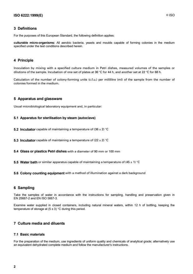 - Scope: Enumeration of aerobic bacteria, yeasts and moulds able to form colonies under the test conditions; applicable to all water types including drinking water and bottled natural mineral waters.