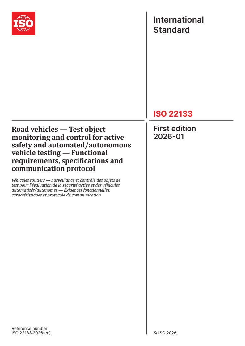 ISO 22133:2026 is a standard published by the International Organization for Standardization (ISO). Its full title is "Road vehicles — Test object monitoring and control for active safety and automated/autonomous vehicle testing — Functional requirements, specifications and communication protocol". This standard covers: This document specifies requirements, procedures and message formats for controlling and monitoring of test objects, used for testing of active safety functions and autonomous vehicles. This document specifies functionality and messaging for monitoring and controlling of test objects by a control centre facilitating an interoperable test object environment. This document defines a communication protocol which allows for the control centre to safely execute tests using test objects from multiple vendors. This document does not specify the internal architecture of the test object nor control centre. This document does not specify how testing of the vehicles shall be performed.