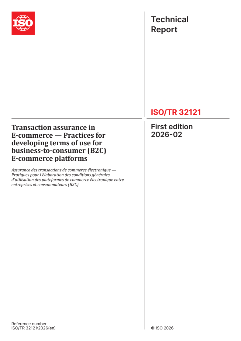 ISO/TR 32121:2026 is a technical report published by the International Organization for Standardization (ISO). Its full title is "Transaction assurance in E-commerce — Practices for developing terms of use for business-to-consumer (B2C) E-commerce platforms". This standard covers: This document provides practices for developing terms of use for business-to-consumer (B2C) E-commerce platforms, including specific principles, key elements and developing processes. This document is applicable to all parties involved in B2C E-commerce transactions and the development process of terms of use.