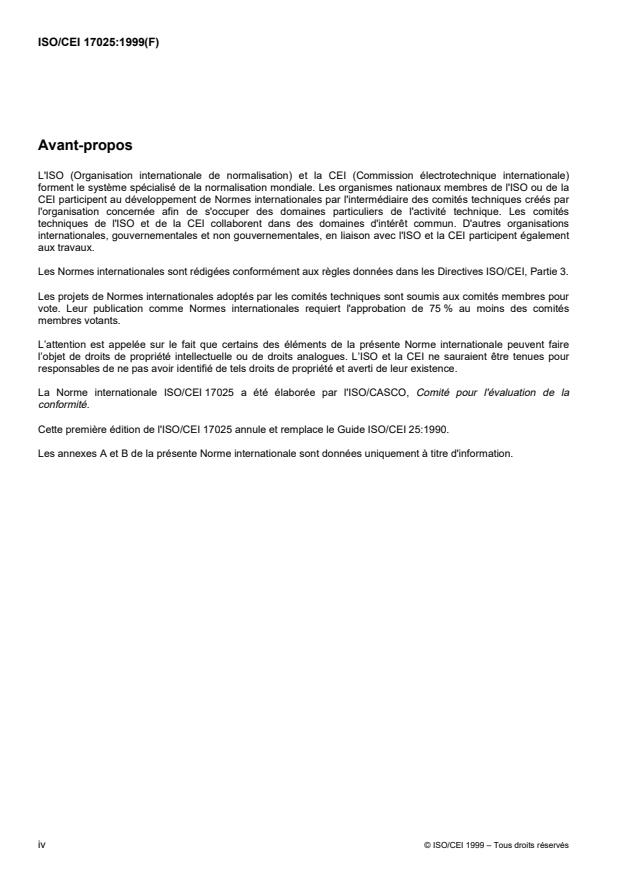 ISO/IEC 17025:1999 is a standard published by the International Organization for Standardization (ISO). Its full title is "General requirements for the competence of testing and calibration laboratories". This standard covers: La présente Norme internationale établit les exigences générales de compétence pour effectuer des essais et/ou des étalonnages, y compris l'échantillonnage. Elle couvre les essais et les étalonnages effectués au moyen de méthodes normalisées, de méthodes non normalisées et de méthodes élaborées par les laboratoires.La présente Norme internationale est applicable à toutes les organisations qui procèdent à des essais et/ou des étalonnages. Par exemple, des laboratoires de première, deuxième et tierce parties, ainsi que des laboratoires où les essais et/ou les étalonnages font partie du contrôle et de la certification de produits.La présente Norme internationale est applicable à tous les laboratoires, quels que soient leurs effectifs, l'étendue du domaine de leurs activités d'essai et/ou d'étalonnage. Lorsqu'un laboratoire ne procède pas à une ou plusieurs des activités traitées dans la présente Norme internationale, telles que l'échantillonnage et la conception/développement de méthodes nouvelles, les prescriptions des chapitres concernés ne s'appliquent pas.Les notes apportent des précisions au texte ou donnent des exemples et des lignes directrices. Elles ne renferment pas d'exigences et ne font pas partie intégrante de la présente Norme internationale.La présente Norme internationale est à employer par les laboratoires pour la mise au point des systèmes qualité, administratif et technique régissant leur fonctionnement. Elle peut également être utilisée par les clients des laboratoires, les autorités réglementaires et les organismes d'accréditation engagés dans des activités de confirmation ou de reconnaissance de la compétence des laboratoires.La conformité aux prescriptions réglementaires et de sécurité relatives à l'exploitation des laboratoires n'est pas traitée par la présente Norme internationale.