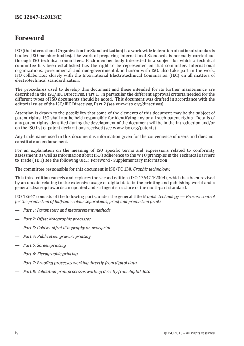 ISO 12647-1:2013 is a standard published by the International Organization for Standardization (ISO). Its full title is "Graphic technology - Process control for the production of half-tone colour separations, proof and production prints - Part 1: Parameters and measurement methods". This standard covers: ISO 12647-1:2013 defines and explains the minimum set of primary process control parameters required to uniquely specify the visual characteristics and related technical properties of process-specific production prints and process-independent simulations of fully characterized printing conditions.
