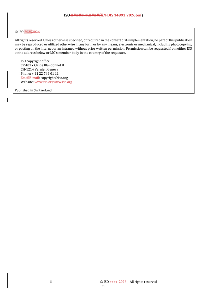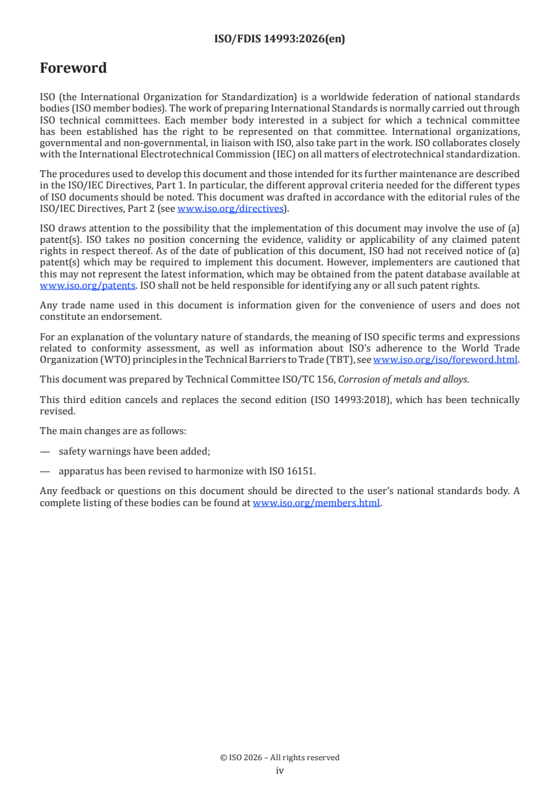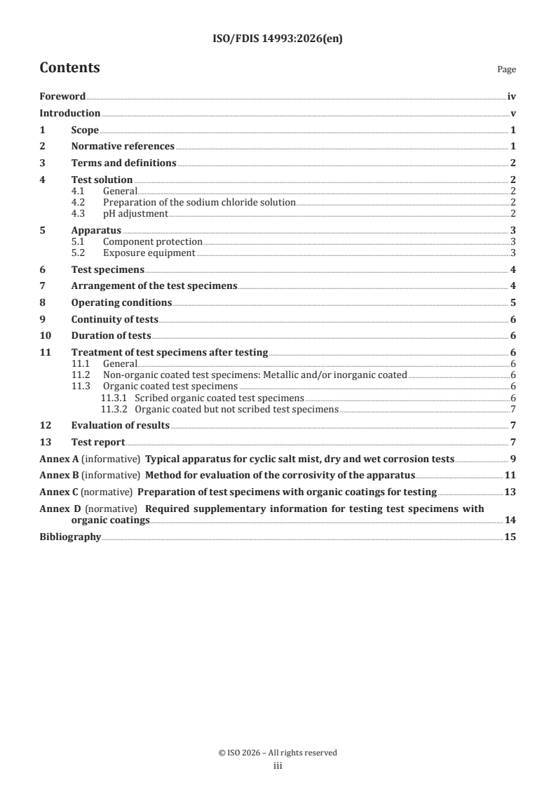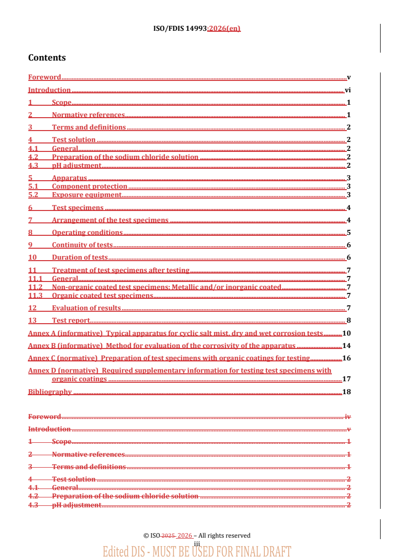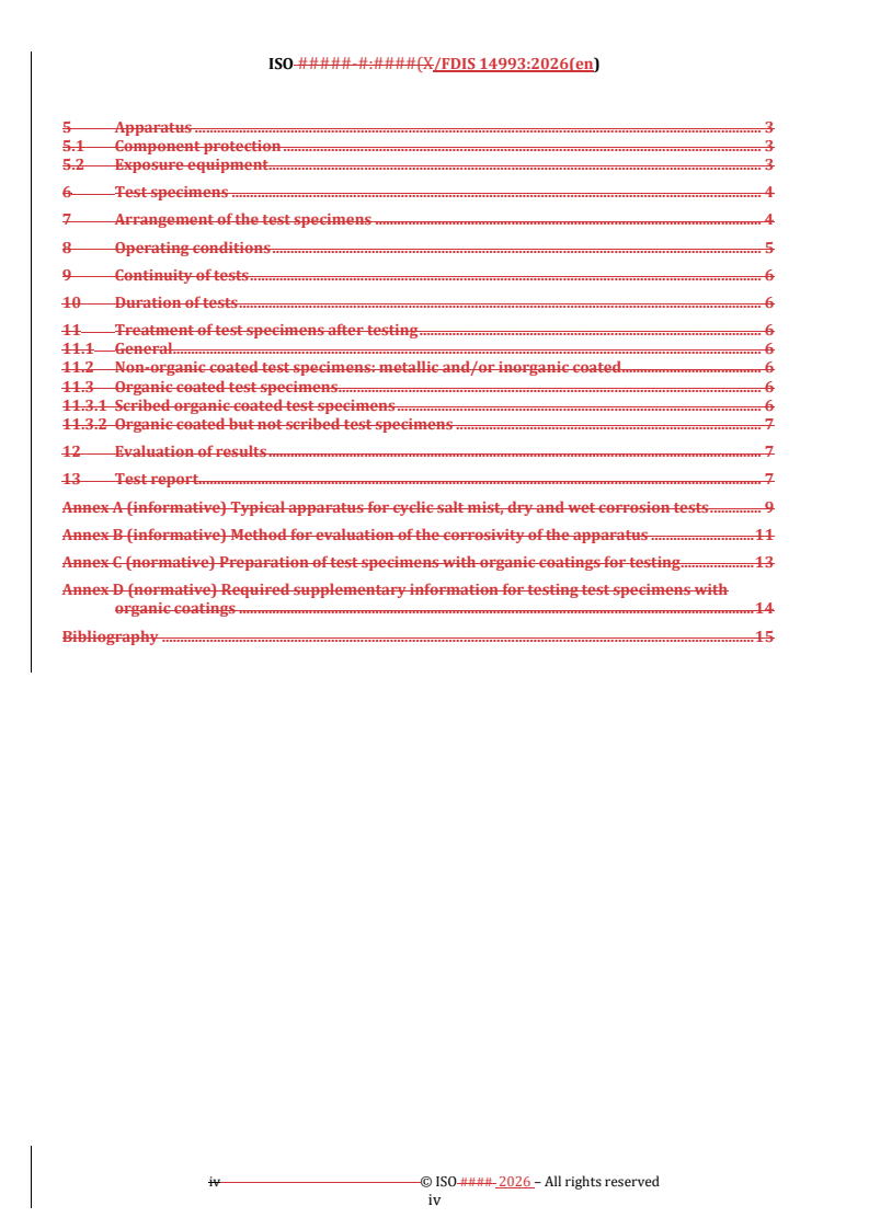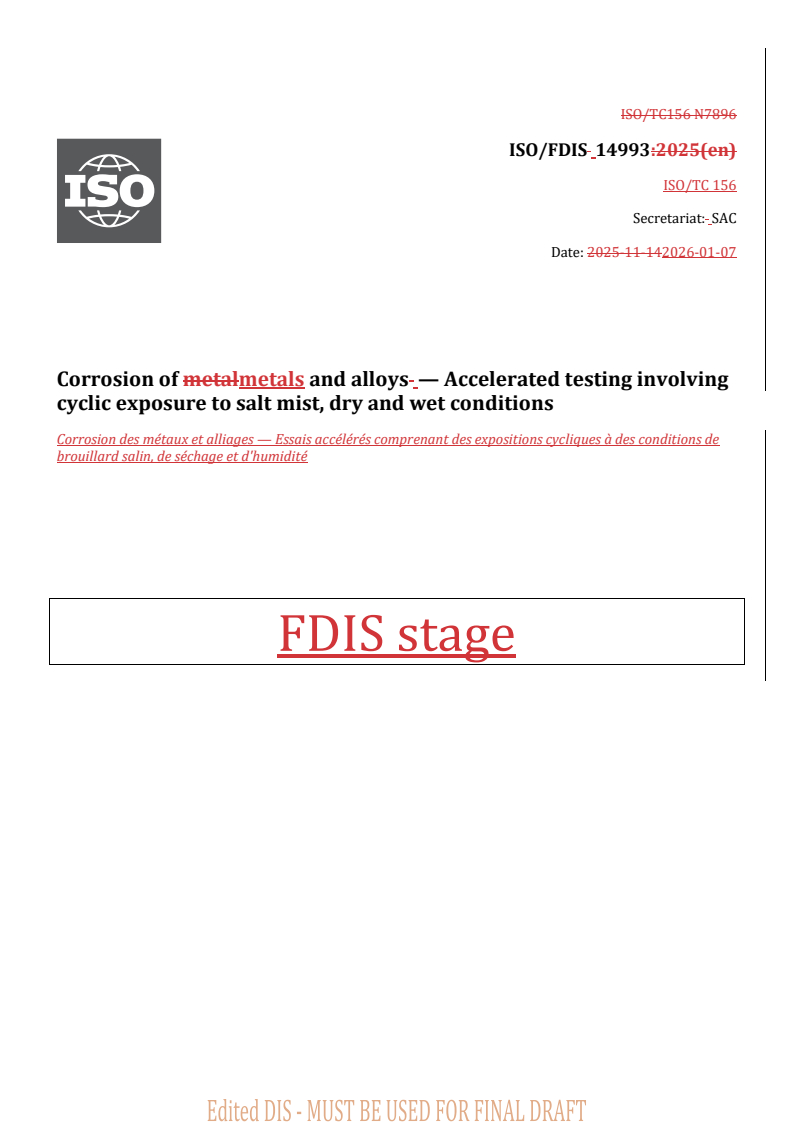 REDLINE ISO/FDIS 14993 - Corrosion of metals and alloys — Accelerated testing involving cyclic exposure to salt mist, dry and wet conditions Released:8. 01. 2026