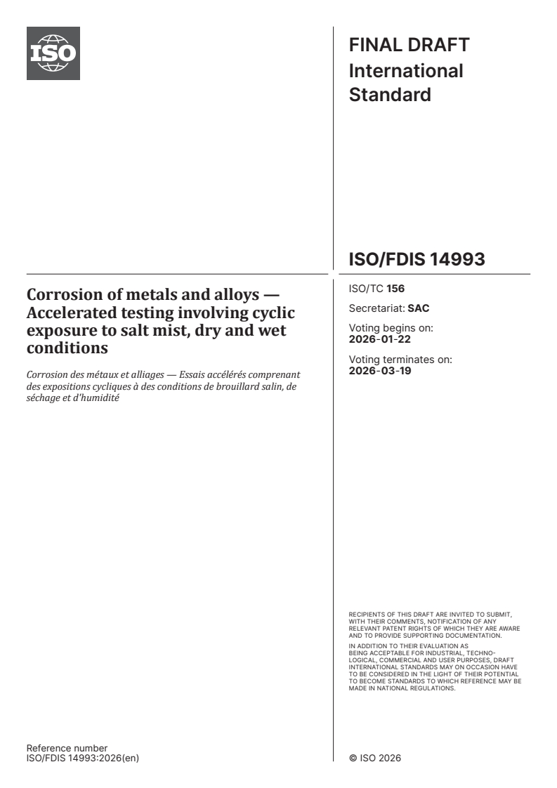 ISO/FDIS 14993 - Corrosion of metals and alloys — Accelerated testing involving cyclic exposure to salt mist, dry and wet conditions Released:8. 01. 2026