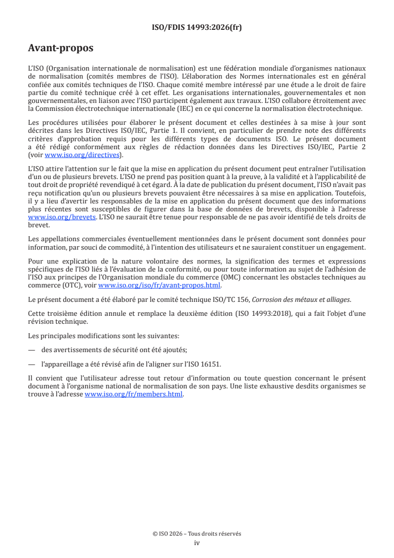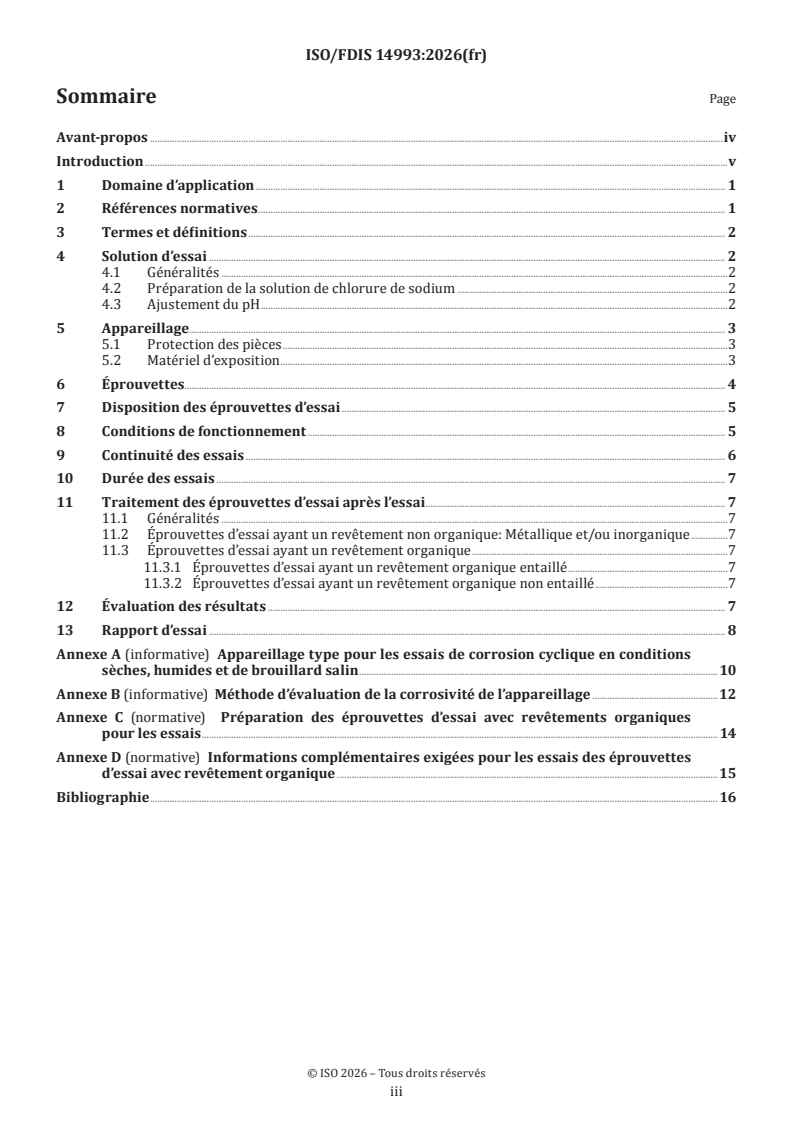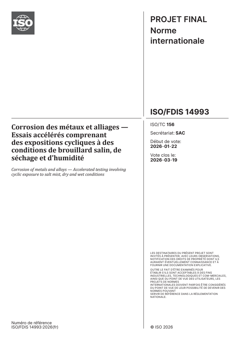 ISO/FDIS 14993 - Corrosion des métaux et alliages — Essais accélérés comprenant des expositions cycliques à des conditions de brouillard salin, de séchage et d'humidité/14/2026