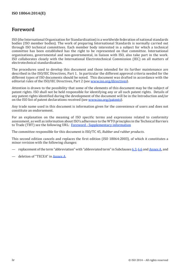 ISO 18064:2014 is a standard published by the International Organization for Standardization (ISO). Its full title is "Thermoplastic elastomers — Nomenclature and abbreviated terms". This standard covers: ISO 18064:2014 establishes a nomenclature system for thermoplastic elastomers based on the chemical composition of the polymer or polymers involved. It defines symbols and abbreviated terms used to identify thermoplastic elastomers in industry, commerce, and government. It is not intended to conflict with, but to supplement, existing trade names and trademarks.