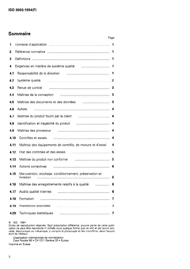 ISO 9003:1994 is a standard published by the International Organization for Standardization (ISO). Its full title is "Quality systems — Model for quality assurance in final inspection and test". This standard covers: La présente Norme internationale spécifie des exigences en matière de système qualité à utiliser lorsque le contrat exige que soit démontrée l'aptitude du fournisseur à détecter toute non-conformité du produit et à maîtriser les dispositions correspondantes pendant les contrôles et essais finals. La présente Norme internationale est applicable dans toutes les situations où l'on peut mettre en évidence, avec une confiance appropriée, la conformité du produit aux exigences spécifiées, ceci étant réalisé à partir d'une démonstration satisfaisante de certaines aptitudes du fournisseur en matière de contrôles et d'essais effectués sur le produit fini. NOTE 1 Pour les références informatives, voir annexe A.