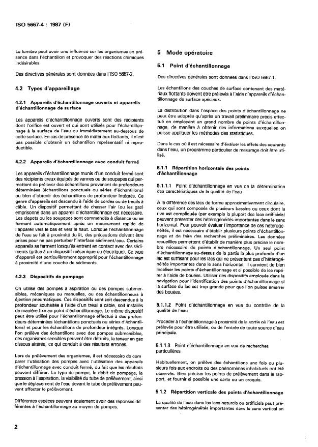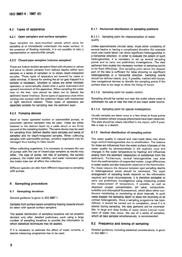 IS0 5667-4 : 1987 (El 4.2 Types of apparatus 51.1 Horizontal distribution of sampling positions 4.2.1 Open samplers and surface samplers 5.1.1.1 quality Sampling point for characterization of water Open samplers are open-mouthed vessels which serve for sampling at or immediately underneath the water surface. In the presence of floating materials, it is not possible to take a representative or reproducible sample. 4.2.2 Closed-pipe samplers (volume samplers) These are hollow-bodied samplers fitted with shutters or valves and serve to obtain samples from defined depths (either spot samples or a series of samples) or to obtain depth-integrated samples. These types of apparatus are lowered by ropes or cable winches. A device for venting the air (or gas) trapped in a sampler is necessary. Shutters or valves are either remotely operated, or automatically closed after a quick downward and upward movement of the apparatus. When sampling the water near to the bed, care should be taken not to disturb the sediment/water interface. Some types of apparatus close when coming into contact with the sediment (those with mechanical or light electrical release). These types of apparatus are especially suitable for sampling near the sediment layer. 4.2.3 Pumping devices Hand or motor operated suction or submersible pumps, or pneumatic ejection samplers may be used. These are either lowered to the desired depth by a cable winch or are firmly secured at the sampling location. The same device may be used for sampling from defined depths (spot samples and series of samples) and for depth-integrated samples. When collecting samples with submersible pumps, sensitive organisms may be damaged thus leading to false results. When collecting organisms, it is necessary to compare the use of pumps with the use of closed-pipe samplers as results may differ. The type of pump, the rate of pumping, the suction pressure, the intake tube visibility, and water movement past the intake tube can all affect the collection. Different species with pumps. can also have different responses to sampling 5 Sampling procedure 5.1 Sampling location General guidance is given in IS0 5667-l. Samples from surface layers containing floating be taken with special surface samplers. material The spatial distribution of sampling locations can be properly decided only alter detailed preliminary work using a large number of sampling locations to provide the information to which statistical techniques may be applied. If it is necessary to estimate the effect of water special measuring programme has to be used. currents, a Unlike approximately circular lakes, those either consisting of several basins or having a complicated shoreline (for example most man-made lakes) can show significant heterogeneities in a horizontal direction. In order to evaluate the extent of such heterogeneities, it is necessary to set up several sampling points and to carry out preliminary investigations. The data gathered then enable the necessary number of sampling points to be fixed effectively. One sampling point above the deepest part of the lake is sufficient for lakes showing no significant heterogeneities in a horizontal direction. Sampling points should be defined clearly, and, if possible, marked with buoys. Use navigational devices to identify the sampling points if the surface area is too large to allow the fixing of buoys. 5.X1.2 Sampling point for quality control Sampling should be carried out near the outlet where water is withdrawn for use or near the inlet of any major water source. 5.