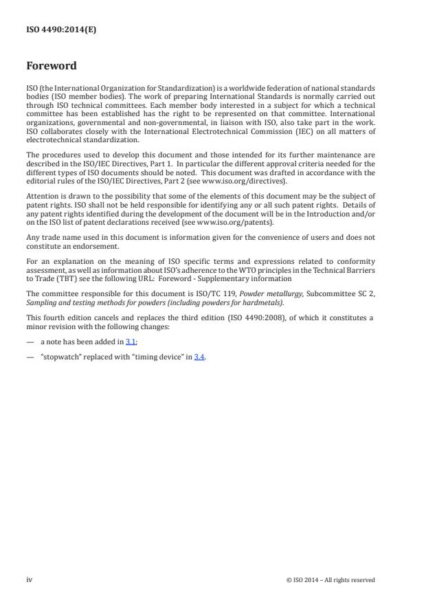 ISO 4490:2014 is a standard published by the International Organization for Standardization (ISO). Its full title is "Metallic powders — Determination of flow rate by means of a calibrated funnel (Hall flowmeter)". This standard covers: ISO 4490:2014 specifies a method for determining the flow rate of metallic powders, including powders for hard metals, by means of a calibrated funnel (Hall flowmeter). The method is applicable only to powders which flow freely through the specified test orifice.