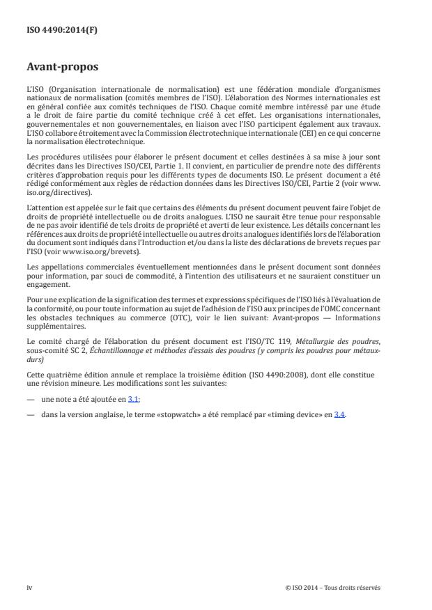 ISO 4490:2014 - Poudres métalliques -- Détermination du temps d'écoulement au moyen d'un entonnoir calibré (appareil de Hall)