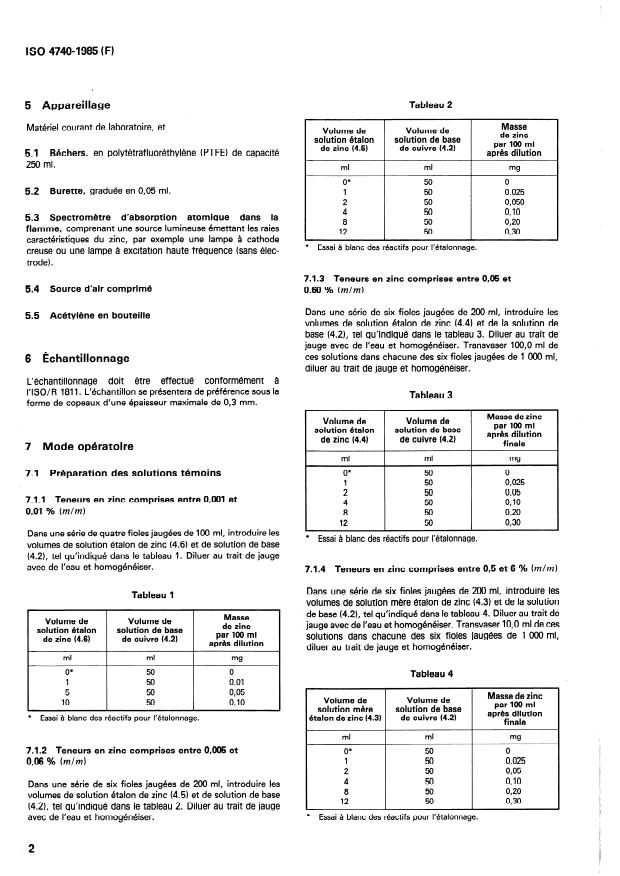 ISO 4740:1985 is a standard published by the International Organization for Standardization (ISO). Its full title is "Copper and copper alloys — Determination of zinc content — Flame atomic absorption spectrometric method". This standard covers: The method is applicable to the determination of zinc contents between 0.001 and 6 % (m/m). ISO 4740 does not apply to copper alloys containing more than 10 % (m/m) of lead. Specifies principle, reagents, apparatus, sampling, procedure, expression of results and test report.