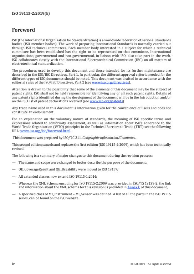 ISO 19115-2:2019 is a standard published by the International Organization for Standardization (ISO). Its full title is "Geographic information — Metadata — Part 2: Extensions for acquisition and processing". This standard covers: Geographic information — Metadata — Part 2: Extensions for acquisition and processing