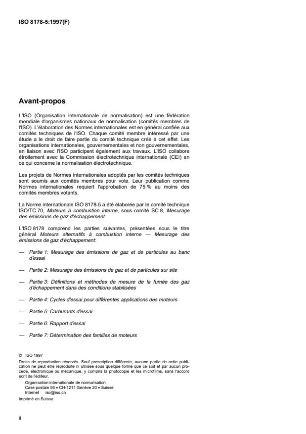 ISO 8178-5:1997 is a standard published by the International Organization for Standardization (ISO). Its full title is "Reciprocating internal combustion engines — Exhaust emission measurement — Part 5: Test fuels". This standard covers: La présente partie de l'ISO 8178 prescrit les carburants dont l'utilisation est recommandée pour effectuer les cycles d'essai des émissions de gaz d'échappement prescrits dans l'ISO 8178-4. NOTE -- Étant donné que les propriétés des carburants diffèrent de manière importante d'un pays à l'autre, une grande variété de carburants différents, que ce soit des carburants de référence ou des carburants du commerce, est énumérée dans la présente partie de l'ISO 8178. La présente partie de l'ISO 8178 est applicable aux moteurs alternatifs à combustion interne pour installations mobile, transportable et/ou fixe, à l'exclusion des moteurs de véhicules conçus originellement pour des applications routières. Elle peut être appliquée aux moteurs utilisés, par exemple, dans les engins de terrassement, les groupes électrogènes et pour d'autres applications. Les carburants de référence sont généralement représentatifs des carburants du commerce, mais les prescriptions qui s'y rattachent sont beaucoup plus rigoureuses. Il est avant tout recommandé de les utiliser pour les mesurages au banc d'essai prescrits dans l'ISO 8178-1. En ce qui concerne les mesurages sur site permettant de déterminer les émissions de gaz d'échappement, que ces données soient incluses ou non dans la présente partie de l'ISO 8178, il est recommandé d'utiliser des feuilles de données analytiques uniformes (voir l'article 5) pour définir les propriétés des carburants en fonction des résultats d'émissions de gaz.